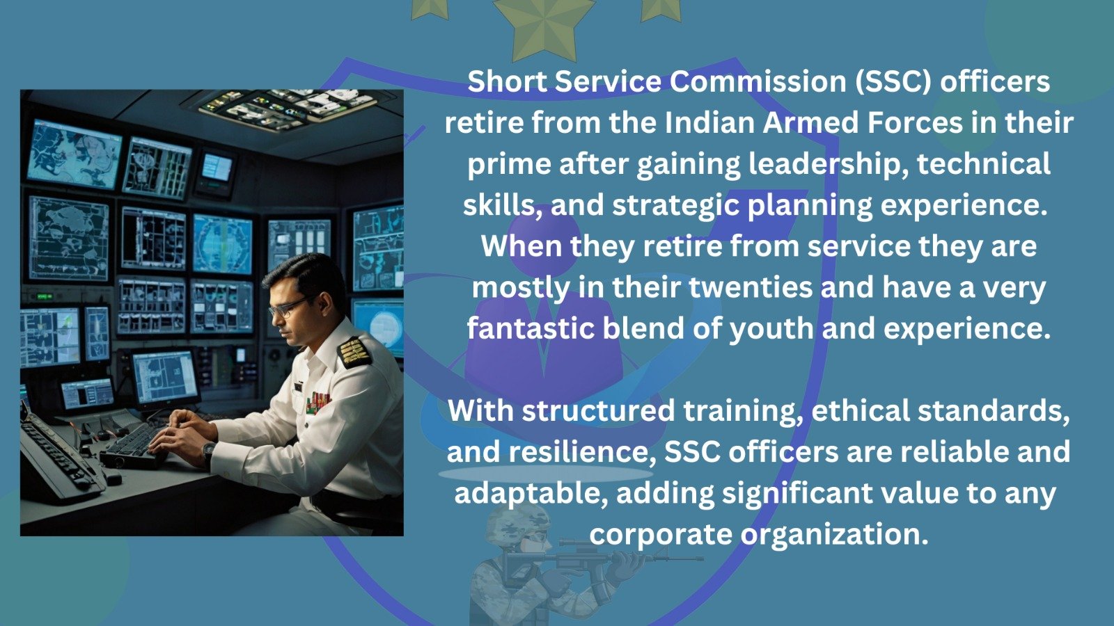 Our mission is to bridge the gap between the unparalleled skills honed in the defense services and the requirements of the corporate world. By unleashing the professional training , unwavering discipline, and unmatched dedication of our retired defense staff, we offer a workforce that brings a distinctive edge to your organization.